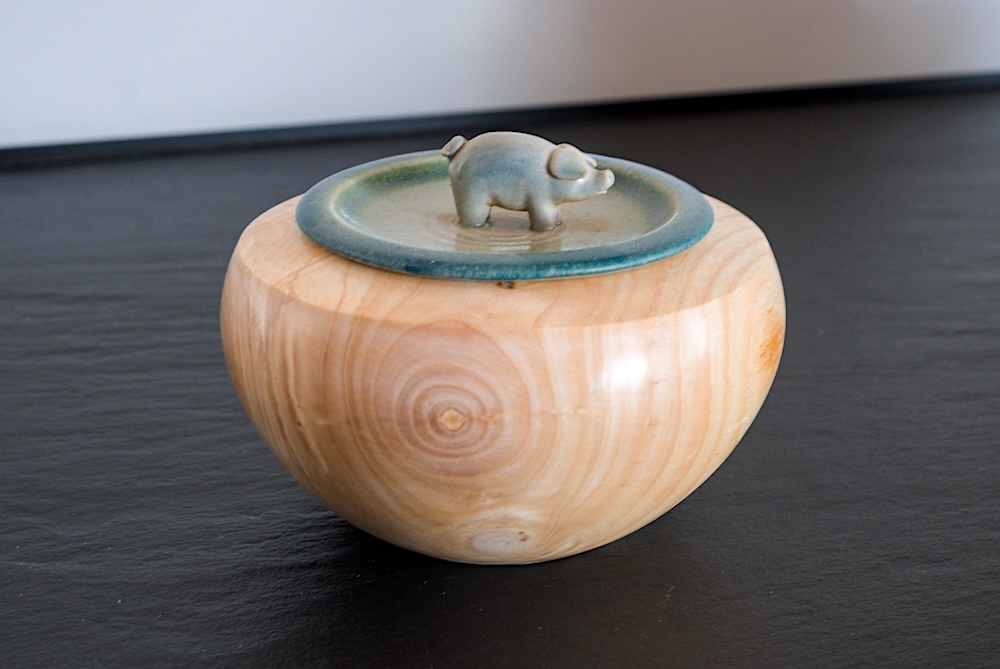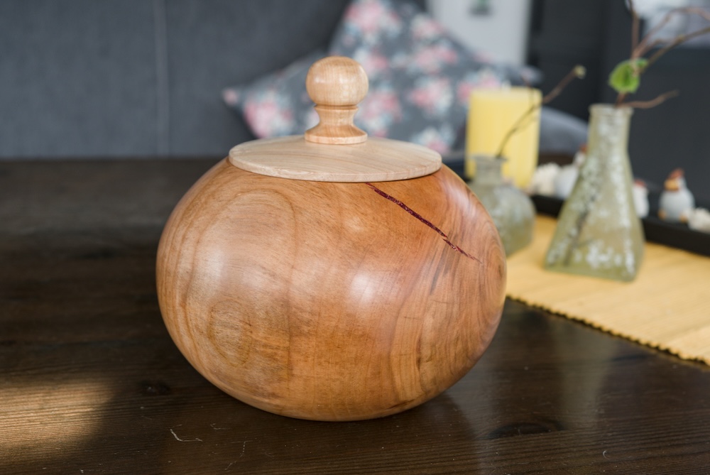 Dose aus Esche mit Deckel aus gestockter Buche und einer Murmel; Durchmesser 10,5 cm, Höhe 11,5 cm